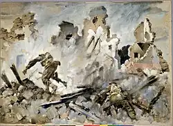 It was soon to be the 6th Brigade's turn. It moved out of its reserve positions and relieved the 133rd Infantry Regiment, part of the U.S. 34th Infantry Division, positioned nearly 2 kilometres (1.2 mi) to the north of Cassino. The 24th and 25th Battalions manned the front lines, uncomfortably exposed to machinegun fire from an overlooking ridge.[95] It was planned for the 6th Brigade to mount its attack on Cassino on 24 February but rainfall delayed it by over three weeks.[96] In the interim, command of the 25th Battalion passed to Lieutenant Colonel John McDuff, who replaced Major Norman, who in turn had taken over from Morten who, earlier in the month, had once again fallen ill and been evacuated.[97] When the 6th Brigade's attack finally commenced, on 15 March, the town had been thoroughly shelled and bombed during the intervening period. Supported by the 19th Armoured Regiment, the 25th Battalion pushed into Cassino.[98] The 25th Battalion was tasked with capturing the western side of the town up to the Continental Hotel whereupon the 26th Battalion was to take up the advance.[99] However, it was unable to achieve its objectives;[100] the Germans defended strongly, assisted by the rubble that hampered the easy movement of the supporting armour.[98] After spending 16 March consolidating what gains it had made, the next day a further attempt was made but this was again largely unsuccessful with each of the 25th Battalion's rifle companies being whittled down to strengths of around 50 men.[101] The other battalions of the 6th Brigade were in a similar state but Parkinson, now commanding the 2nd New Zealand Division, was reluctant to commit more infantry to the battle.[102] However, he finally ordered the 5th Brigade into the town on 20 March and the 25th Battalion was withdrawn to a secondary defensive position.[103] The 5th Brigade was no more successful than the 6th Brigade and was reduced to simply holding what ground it had gained amongst the rubble of Cassino.[104]