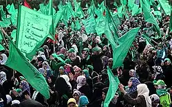 The 25th anniversary of the founding of Hamas took place on 8 December 2012. A rally involving hundreds of thousands of Palestinians was held in the Gaza Strip and various celebrations were conducted all over the Palestinian Authority.[1] Thousands of jubilant Hamas supporters openly raised green flags in the West Bank, to celebrate the Islamic organization's 25th anniversary.[2]