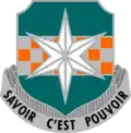 The unit's distinctive unit insignia (DUI) is a silver color metal and enamel device 1+18 inches (2.9 cm) in height overall consisting of a shield representing the unit's coat of arms with a silver scroll attached around the sides and bottom of the shield inscribed, "SAVOIR C'EST POUVOIR" (Knowledge is power, in French) with black-colored lettering.[30]
