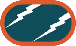 The 313th's flash is a teal blue shield-shaped embroidered item with a semi-circular base. Around the edge of the flash is a 18 inch (0.32 cm) orange border, two white lightning bolts bendwise sinister, one issuing from the top of the flash and one issuing from the lower right side; the overall dimensions are 2+14 inches (5.7 cm) in height by 1+78 inches (4.8 cm) in width. The airborne background trimming is a teal blue oval-shaped embroidered item edged with a 18 inch (0.32 cm) orange border two white lightning bolts bendwise sinister, one issuing from the top of the item and one issuing from the right side. The overall dimensions are 1+38 inches (3.5 cm) in height by 2+14 inches (5.7 cm) width.[31]
