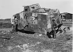 On 5 September 1916, the 56th Division went back into the line during the Battle of Ginchy. 168th Bde attacked before dawn with partial success, but lost direction, and their relief later in the day by 167th Bde caused some problems.[63] For the Battle of Flers–Courcelette on 15 September, 167th Bde attacked towards Bouleaux Wood with two of the new tanks in support. The attack went in at 06.20, but one tank had broken down, while the other was hit by a field gun and set on fire after giving early support. Because neighbouring troops could not take the flanking strongpoint known as 'the Quadrilateral' the brigade's attack made little progress and the attack was called off in the afternoon.[64] It was the same story when the division made a second attempt on 18 September, but at least the Quadrilateral fell. When the division attacked again on 25 September (the Battle of Morval), German resistance began to crumble, and by midnight 167th Bde was in the lower part of Bouleaux Wood and beyond the derelict tank from the 15 September fighting.[65]