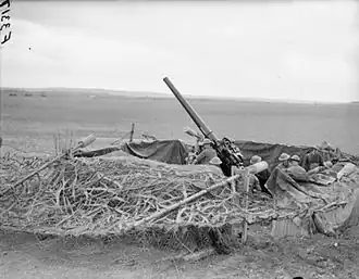 By now, the Panzers of the Wehrmacht's Army Group A had broken through the Ardennes and threatened the BEF's flank. 210 AA Battery of 73rd AA Rgt and two Troops of 8 S/L Bty of 2nd Searchlight Rgt had been defending Conteville and Crécy airfields under 2 AA Bde when the German forces took nearby Péronne. On 20 May they were ordered to move south-west to Rouen to come under 3 AA Bde. However, 2nd Panzer Division was already in Abbeville blocking the way, and the battery had to fight a rearguard action with enemy ground troops to get to the coast and make it back to Dunkirk.[33][34][35][36]