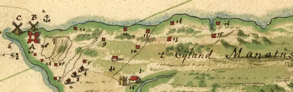 10. ^ Joan Vinckeboons (1639). "New Amsterdam" (Map). Manatvs gelegen op de Noot Riuier [Manhattan situated on the North River] (in Dutch). Retrieved February 8, 2024.