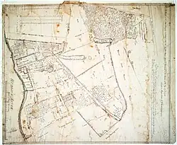 A few years before the start of the war, Kieft issued a grant for farm land located where the Walker House would later be built. The land holder was a man named Jan Cornelissen of Rotterdam, also called Jan Van Rotterdam.[8]: 149 [9] A map made in 1639 by Dutch cartographer Joan Vinckeboons shows the property and its farmhouse.[10] A detail from this map, shown here as Image No. 1, designates the property by the number 14 at center (the other number 14, to the right, indicates a second property granted to the same man). The map is oriented with north to the right so that the town of New Amsterdam, within its walls, is at far left. After Van Rotterdam's death in 1643, the property passed to his widow, who died in 1645.[11]: 192  In 1652, the Dutch West India Company seized the property for non-payment of a debt and then leased it to Jan Jansen Langendye for ten years on his promise to pay the debt. In 1662, the New Netherland council granted the land jointly to Allard Anthony and Paulus Leenderts van der Grift. Since both men had held the position of burgomaster, an elected position analogous to mayor, the property, which had been known simply as land formerly occupied by Jan Van Rotterdam, became known as Burgomasters' Bouwerie (burgomasters' farm). After the British took over the colony in 1664, the governor of New York confirmed the two men as joint owners.[8]: 118  In 1679, Van de Grift having previously acquired Anthony's interest in the property, he sold it to Jellis Jansen Mandeville. In 1701, Mandeville sold it to his son David.[12] From this time forward, the property was called The Mandeville Farm.[8]: 118  The document recording the sale, called an indenture, says it covered an area of fifty-three morgen, which at about one-half acre per morgen is equivalent to about twenty-six and one-half acres. It also says the property included at least one house, stable, orchard, garden, and meadow ground.[12] It is named "Jellis Mandivill's Land" in a map made in 1773. A detail from a digital reproduction of this map is shown here as Image No. 2. The Mandeville farm appears on the top left (northwest) corner of this map.