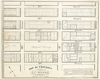 In 1833, Moore partnered with a builder named James N. Wells to offer leases for the construction of other buildings within the bounds of his holdings. Aiming to develop the property as a relatively low density residential neighborhood, the two men made a plan to prepare side streets and lay out a grid of lots, each 25 feet wide and 100 feet deep, for which they would offer long-term leases.[22][17] The two men consulted with the leaseholders who came after Walker signed his lease and they mutually agreed to require themselves and subsequent leaseholders to build mostly single-family structures having ten-foot setbacks from the street. The houses were to be no more than two stories and to have back yards accessible only from the houses themselves, not via a side alleyway.[14] The group prohibited stables and commercial buildings from side streets and required tree planting.[25]