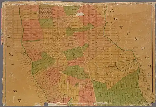 It is also shown on a map of original grants and farms made by Jennie F. Macarthy and published in 1928. A detail from a digital image of this map is shown here as Image No. 3. The map shows the boundaries of farms on the modern grid of streets and each block has been given a sequential number. The Mandeville Farm covers some or all of blocks 713–717 on the west, followed by blocks 739–744, and parts of blocks 765–770. It is labeled "Burgomasters Bouwery" and "David Mandeville Farm" and it notes the grant from Governor Stuyvesant to Paulus Leenderts van de Grift and Allard Anthony dated March 14, 1662. In 1829, the Walker House was built in the northwest corner of block 744. From David Mandeville, the property passed to David Campbell and thence to James Rivington. Benjamin Moore obtained it from Rivington and in 1813 conveyed it to his son Clement Clarke Moore.[13][14]