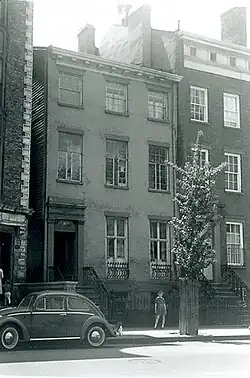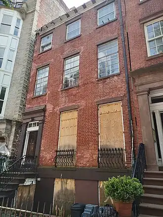 Hugh Walker paid forty dollars per year for his leasehold in 1829. Moore's lease gave Walker seven years in which to build "a good and substantial house...being two stories or more, constructed of brick or stone, or having a brick or stone front." Walker, who earned his living as a grocer, complied by building a two and one-half story clapboard-sided frame house having a north-facing Federal-style facade of red brick laid in Flemish bond. The house was set back from the street, allowing for palings and a small garden. It was about twenty-three feet wide, leaving a space of about two feet to the edge of the lot on its east side.[14] In 2011, a record in New York City's Automated City Register Information System described the property as "Beginning at a point on the southerly side of 20th Street, distant 100 feet westerly from the corner formed by the intersection of the southerly line or side of 20th Street with the westerly line or side of Ninth Avenue; running thence southerly, parallel with Ninth Avenue, 109 feet; thence westerly, parallel with 20th Street, 25 feet; thence northerly, parallel with Ninth Avenue, 109 feet to the southerly line or side of 20th Street; thence easterly, along the southerly line or side of 20th Street, 25 feet to the point or place of beginning."[28]