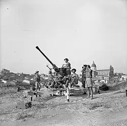 51st (H) Division was designated for the assault landing in Sicily (Operation Husky) on 10 July 1943. 40th LAA Regiment's sea crossing was disrupted when the ships were attacked by U-boats and aircraft. Once ashore the divisional LAA regiments were assigned to beach defence, though they were hampered by the lack of a workable early-warning system. LAA batteries were reduced to firing prepared concentrations, either directional ('Curtains') or overhead ('Umbrellas'), which were ineffective and wasted scarce ammunition. However, the landings made good progress against negligible opposition, and 51st HD was well forward by nightfall. It was then directed to capture Palazzolo Acreide, which it achieved by the end of 12 July. The LAA unit handed over beach defence as the AA brigades began landing. 51st HD took Vizzini on the night of 14/15 July, and was then redirected towards the north east in a high-speed move to Paternò. However, resistance had stiffened, the division was unable to cross the River Simeto, and it had to fight hard to capture Gerbini Airfield. The division went onto the defensive on 21 July.[26][27]