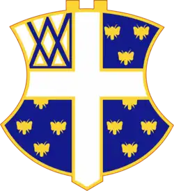 A Gold color metal and enamel device 1+14 inches (3.2 cm) in height consisting of a shield blazoned: Azure, semé of bees Or, a cross Argent, on a canton of the last two saltires of the field.