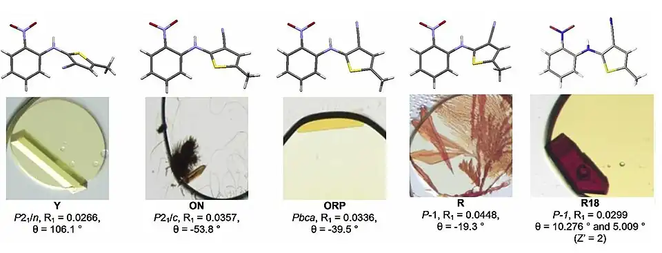 - ^ a b Yu, Lian (2010). "Polymorphism in Molecular Solids: An Extraordinary System of Red, Orange, and Yellow Crystals". Accounts of Chemical Research. 43 (9): 1257–1266. doi:10.1021/ar100040r. PMID 20560545.