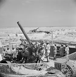 By the beginning of May, First Army was ready for its final assault on Tunis, Operation Vulcan. The AA plan or 'Vulcan' was straightforward: 52 AA Bde would hold three HAA and three LAA regiments, a S/L troop and a Z battery of rocket-launchers, all on their wheels and ready to move into Tunis and Bizerte immediately behind the leading battle groups. DElayed by a German counter-attack, the assault went in on 6 May and covered 15 miles (24 km) on the first day. The leading British armoured units entered Tunis on the afternoon of 7 May while US units entered Bizerte simultaneously. After a series of conflicting reports from the cities, 52 AA Bde was called forward. In fact, neither Tunis nor Bizerte was clear of the enemy. At Bizerte the AA advance parties were shelled from outside the town, and two batteries of 29th LAA Rgt had to be employed as infantry to flush out resistance.[44][45] After Operation Vulcan, 52 AA Bde deployed the following forces:[46]