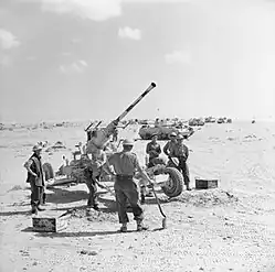 10th Armoured Division was reconstituted for the pursuit after Alamein, but 53rd LAA Rgt was no longer with it, having left on 2 November.[105][111] By January 1943 the regiment (with 36 Bofors guns) was in Libya with 2 AA Bde on tasks for XXX Corps.[112] When the North African Campaign ended in May 1943 with the Axis surrender in Tunisia, the regiment was with 12 AA Bde, which had followed Eighth Army's advance for 1,500 miles (2,400 km), supplying mobile AA groups to defend forward landing grounds for the Desert Air Force as they were captured. Bofors guns were frequently employed to 'sweep' with automatic fire when Luftwaffe fighter-bombers attacked out of the sun.[84][113][114][115]