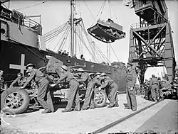 The regiment's last details arrived in England at dawn on 1 June, 158 Bty aboard the minesweeper HMS Hebe.[83] AA units returning from France were rapidly reinforced, re-equipped where possible, and redeployed for future integration into existing defence plans. 53rd LAA Regiment went to Wimborne Minster, where it re-equipped with Bofors guns.[100] It still formed a mobile part of Home Forces, and at New Year 1941 it joined the GHQ Reserve with its own signal section of the Royal Corps of Signals. By March, it had gained its own transport section of the Royal Army Service Corps[84][101][102] In March 1942, the regiment transferred from the GHQ Reserve to direct War Office Control, preparatory to going overseas.[103] It left the UK during July 1942.[104]