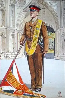 6 Royal Anglian Officer with the Bn colours at the Abbey Gate from a painting by & with the permission of Alix Baker, 1996.Battalion Headquarters, in Bury St Edmunds