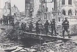 On 22 August a patrol from the 13th Parachute Battalion succeeded in crossing the eastern branch of the river, and was quickly reinforced by the rest of the battalion. They fought for three hours to gain a proper foothold and were then forced to withdraw again.[26] The next day, patrols from the 7th Parachute Battalion discovered that the Germans had withdrawn during the night, and they therefore crossed the river and secured the high ground to the north, closely followed by the rest of the brigade.[27] On 25 August the 1st Special Service Brigade took over as the lead formation, and headed towards Beuzeville, but once again German defences held up the advance. The 3rd Parachute Brigade and the 4th Special Service Brigade carried out a left flanking attack to capture the village, suffering heavy losses from German mortar fire.[28]