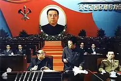 The 1st plenum of the 6th Central Committee, to elect the central party leadership, was held immediately after the 6th Congress.[11] 34 members were elected to the 6th Politburo, an increase from 15 in the 5th Politburo.[8] Of these 34, 19 were full members and 15 candidate members.[8] Five members were elected to the Presidium,[8] and Kim Jong Il was ranked fourth in the hierarchy of the Politburo and the Presidium.[8] The 6th Secretariat was composed of nine members,[12] with Kim Jong Il ranked second.[12] The size of the Secretariat did not change from the 5th Congress, but of its nine members only Kim Il Sung was from the party's "revolutionary generation" (60% of the members of the 5th Secretariat came from that generation).[12] Kim Il Sung and Kim Jung-rin were the only incumbents to be reelected.[13] The elected 6th Central Military Commission (CMC) was composed of 19 members, of which Kim Jong Il ranked third (behind Kim Il Sung and O Jin-u).[13] This marked the first time in the party's history that the CMC membership was made public.[13] Kim Il Sung and Kim Jong Il became the only officials with seats in all four bodies: the Presidium, Politburo, Secretariat and CMC.[13] While Kim Jong Il was outranked in the Presidium, Politburo and Secretariat, none of the members who outranked him had positions in other bodies (except for O Jin-ju, second-ranked member of the CMC).[13] Below is a list of members (and their respective rankings) of the Presidium, full and candidate members of the Politburo, Secretariat and CMC:[14]
