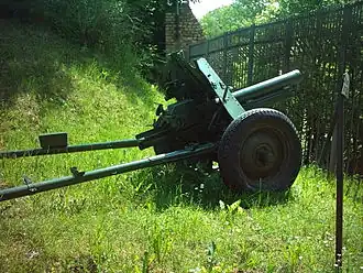 The 76-mm regimental gun M1943 (OB-25) (Russian: 76-мм полковая пушка обр. 1943 г. (ОБ-25)) was a Soviet infantry support gun developed in 1943 by M. Yu. Tsiryulnikov at the ordnance plant in Motovilikha. The gun used a modernized barrel from the 76 mm regimental gun M1927 and the carriage from the 45 mm anti-tank gun M1942 (M-42). The gun was intended for destruction of light field fortifications and openly placed personnel by direct fire. HEAT shells gave it limited anti-armor capabilities. 76.2-mm regimental guns M1943 completely replaced M1927 guns in production that year and were built until the end of the German-Soviet War. Soon after the end of the war the production ceased due to insufficient range and muzzle velocity.
