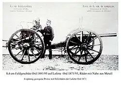 The Swiss gun was mounted on the iron carriage of the 4-pounder breechloader, which was changed to fit the new gun.[10] Later the 8.4 cm Feldgeschütz Ord 1879 would be mounted on the same carriage. Nevertheless, the carriage only applied to the 145 guns serving in the field army.[32]