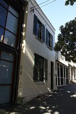 Victorian Georgian, two storey townhouse with attic and basement. Shutters to all windows, fanlight over front door. Storeys: 2 Construction: Painted rendered masonry, slate roof. Painted timber joinery. Iron lace balustrade. Style: Victorian Georgian.[1][2]