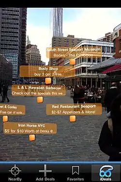 Users can receive alerts regarding nearby deals based on the categories they select or switch to an augmented reality view on an iPhone that overlays a brief description of the offer and its relative location to the user. Registered users can view deals/coupons and opt to receive coupon alerts via text message from merchants in categories they select or based on deals near their current location.[4][10][22] Coupons are transmitted to users based on their preferences set on the website or mobile app and are redeemable at the merchant by showing them the coupon message on the phone.[10] Coupons include local restaurants, retail, entertainment, and beauty & spa among others.[1][2][3][6][15]