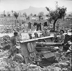 In 1935 most of 47th (2nd London) Division was converted into 1st Anti-Aircraft Division and the remaining London units were reassigned. By the outbreak of war in 1939 65th Fd Bde had joined 44th (Home Counties) Division.[3][96][97] When the RA adopted the term 'regiment' instead of the obsolete 'brigade' for a lieutenant-colonel's command, the unit became 65th (8th London) Field Regiment, RA, on 1 November 1938.[12][7][91]
