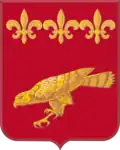 - Shield: Gules a falcon striking bendsinisterwise, in chief three fleurs-de-lis fess Or.