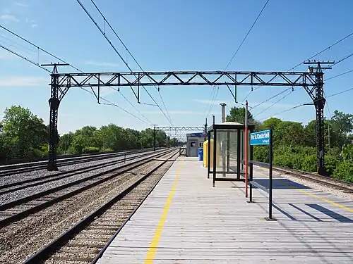 91st Street (Chesterfield) is an electrified commuter rail station along the Metra Electric Main Line in the Burnside neighborhood of Chicago, Illinois. It is located at 91st and Dauphin Streets and is 11.4 miles (18.3 km) away from the northern terminus at Millennium Station.[2] In Metra's zone-based fare system, 91st Street (Chesterfield) is in zone 2. As of 2018, the station is the 226th busiest of Metra's 236 non-downtown stations, with an average of 23 weekday boardings.[1]