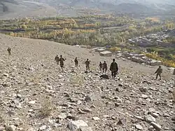 Charlie Company served under several successive Task Forces from 2011 to 2012: TF Warrior, TF Thunder, TF Gunner, and TF Black Scarves. Charlie operated out of COP Sayed Abad (Sayed Abad District, Wardak Province), COP Dashe Towpe[13] (Chak District, Wardak Province), and COP Band E Sardeh (Andar District, Ghazni Province) with the mission to fight as Infantry. In Wardak, Charlie Company augmented an Afghan Army Kandak and TF Warrior in a clear-hold-build operation to secure the Chak District Center. After helping to establish security and an enduring Afghan and ISAF presence in the District Center, Charlie continued partnered counterinsurgency operations alongside their Afghan Army partners throughout eastern Chak. In December 2011, Charlie moved to COP Band E Sardeh in Andar District, Ghazni to replace Alpha Company, 2nd Battalion, 2nd Infantry Regiment, 1st Infantry Division. Co-located with an Afghan Army Kandak, Charlie conducted partnered counterinsurgency operations in Andar, Dih Yak, and Giro Districts. Charlie's counterinsurgency efforts, empowering local leaders, and strengthening the local Afghan Army were likely instrumental in the "Andar Uprising" against the Taliban in the summer of 2012, beginning just as Charlie was redeploying.[14][15]