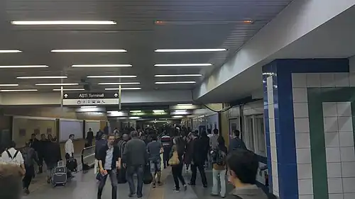 AŞTİ is an underground station and the western terminus of the Ankaray line of the Ankara Metro in Çankaya. It is located on the east side of Mevlana Boulevard, across from the Ankara Intercity Bus Terminal (AŞTİ). AŞTİ station consists of two side platforms and opened on 30 August 1996, together with the Ankaray line.[1] Connection to the bus terminal is available via a passageway underneath Mevlana Boulevard.