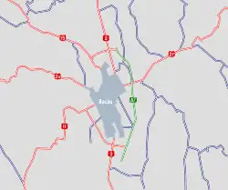 The route of the Focșani bypass, which opened on 7 November 2024,[27] is notorious for its so-called "hump", backed by the local authorities of the city of Focșani on the grounds of an unapproved "general urban plan". The CNAIR tried unsuccessfully to convince the local authorities to support the variant of a straight route.[28] Plans call that at Rădăuți (Milișăuți) the road towards Siret becomes an expressway, however this section is yet to have a route number assigned.[29][30]