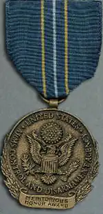 The Meritorious Honor Award is an award of the United States Arms Control and Disarmament Agency, an independent agency charged with implementing and verifying arms control strategies which has since been merged into the Department of State. Similar versions of the same award exist for the United States Agency for International Development, the Department of State, and the former U.S. Information Agency. This award has been replaced with the State Department's Meritorious Honor Award. This award was presented to groups or individuals in recognition of a special act or service or sustained outstanding performance.