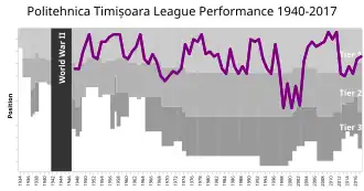 Chart showing the progress of Politehnica Timișoara's league finishes from their 1940 debut in the national leagues to the present.