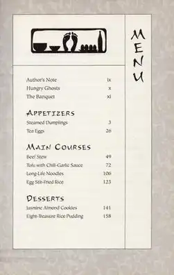 The book is organized as a Chinese menu. From appetizers and main courses to desserts, every story ends with an authors note and a recipe based on the story.