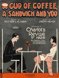 "A Cup of Coffee, a Sandwich and You" is a 1925 song written by Joseph Meyer, with lyrics by Al Dubin and Billy Rose. The title was inspired by the famous line "A Jug of Wine, a Loaf of Bread--and Thou" from the Rubaiyat of Omar Khayyam.[1][2]