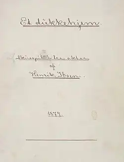 Ibsen started thinking about the play around May 1878, although he did not begin its first draft until a year later, having reflected on the themes and characters in the intervening period (he visualized its protagonist, Nora, for instance, as having approached him one day wearing "a blue woolen dress").[13] He outlined his conception of the play as a "modern tragedy" in a note written in Rome on 19 October 1878.[14] "A woman cannot be herself in modern society", he argues, since it is "an exclusively male society, with laws made by men and with prosecutors and judges who assess feminine conduct from a masculine standpoint!"[15]