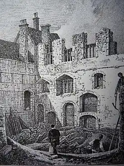Following the Dissolution, the abbey is said to have served for a time as the residence of John Clerk, Bishop of Bath and Wells, a veteran diplomat of Henry VIII; the King seizing the Bishop's own London residence in compensation.[24] It also came to house officers of the Tower of London. In 1552, under Edward VI, it was given to Henry Grey, 1st Duke of Suffolk, the father of Lady Jane Grey.[25] In 1554 it reverted to government use, housing the Ordnance Office and its stores, transferred there from the Tower of London. Some of the abbey buildings survived until their destruction by fire in 1797.