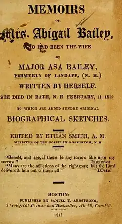 Abigail's memoirs were written as a conversion narrative for her Congregationalist church, and she never intended for them to be published. Following her death, the memoirs were brought by family and friends to the Reverend Ethan Smith of Haverhill, who had been the pastor of the church where she converted. The congregation and the pastor thought that the memoirs provided an example of faith in God despite the disgraceful actions of her husband.[1] Smith edited and published the memoirs, writing that "few lives of christians, in modern days, have afforded such rare materials for instructive biography."[5] Her memoirs were published as Memoirs of Mrs. Abigail Bailey, Who Had Been the Wife of Major Asa Bailey, Formerly of Landaff, (N.H.) Written by Herself. The memoirs are among few accounts of explicit domestic violence written by a woman in early America[1] and may have been the first autobiographical account of incest published in the United States.[6] Written in the style of a woman's religious autobiography, its tone and content place it within the tradition of American captivity narratives.[5]