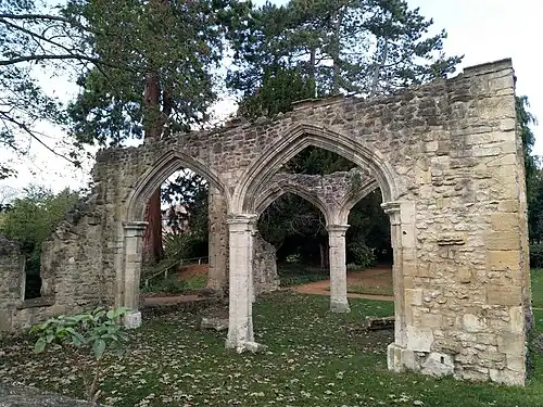Associated monastic buildings do, however, survive, including the Abbey Exchequer, the timber-framed Long Gallery, the abbey bakehouse, (all in the care of the Friends of Abingdon Civic Society) the abbey gateway, St John's hospitium (a pilgrims' hostel) and the Church of St Nicolas. One of the original fireplaces was removed and is now still intact in Lacies Court, Abingdon School.[20]