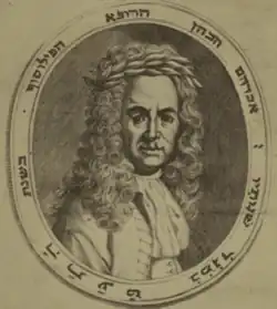 In 1700 Cohen published in Venice his Derashot 'al ha-Torah,[3] a common title for homilies (sermons) and commentary on the Pentateuch (Torah). His Derashot 'al ha-Torah is also known as Kebod Chacamim or Kevod Ḥakhamim (The Glory of Wise Men).[4] In 1719 he published in Venice his Kehunnat Abraham (כהנת אברהם), a book of religious poems in Hebrew written in the manner of and inspired by the Psalms (Tehillim). Cohen used a number of different meters in his poetry.[3] His Kehunnat Abraham created a stir within the Jewish community of the Venetian Republic and other parts of Italy, full of compliments. Joseph Fiametta published a poem in praise of it,[5] as did Issac Vita Cantarini and Shabbethai Marini, both in the mode of the times, sonnet form.[6] Cohen's engraved self-portrait appears on the fly-leaf of his Kehunnat Abraham complete with wig.[7]