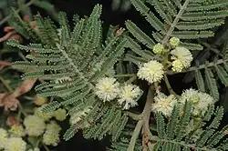 Acacia constablei, commonly known as the Narrabarba wattle,[3] is a species of flowering plant in the family Fabaceae and is endemic to a restricted part of New South Wales, Australia. It is a straggling or erect shrub with smooth bark, knobbly branchlets, bipinnate leaves with 6 to 14 pairs of pinnae, each with 9 to 30 pairs of more or less oblong or narrowly oblong pinnules, spherical heads of pale yellow or cream-coloured flowers, and straight to slightly curved, leathery pods.