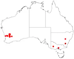 Sandpaper wattle is found in eight scattered populations over a range of 180 km (110 mi) in the Merredin district in the Western Australian Wheatbelt northeast of Perth, over an area roughly bounded by Nungarin in the south, Wongan Hills in the west and east of Mount Churchman in the east.[1] It generally grows on or near granite outcrops, and occasionally on sandplains, or a range of soils such as silt, clay, loam or sand.[7]