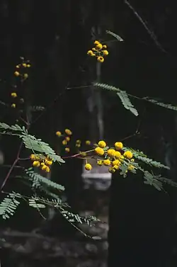 Acacia pruinosa has bipinnate foliage and is found scattered through the boulder landscape of Girraween National Park, Queensland