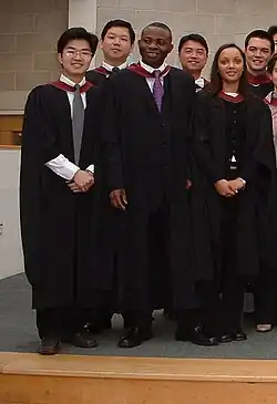 The academic dress prescribed by the University of Bristol is a mixture of that prescribed by Cambridge and Oxford.[1] Bristol has chosen, for graduates, to mainly specify Oxford-style gowns and Cambridge-style hoods. Unlike many British universities, the hood itself is to be "University red", lined with a specified colour. University red is defined to be Pantone 187. Bristol also specifies that undergraduates are to wear gowns "of the approved pattern" in certain circumstances, although the pattern itself is not specified. This is not too important since, in practice, undergraduates are only required to be gowned when graduating or at dinner as a member of Wills Hall.