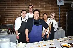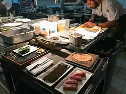 The restaurant served five- and ten-course tasting menus,[6][7] as well as "upscale" contemporary American cuisine such as cheeseburgers, lobster rolls,[8] lobster pot pie and a Wagyu steak dinner.[9] The dishes on its menu were often heavy and rich. Writing for Time Out, Julia Kramer noted the relative affordability of its prices compared to similar restaurants.[4]