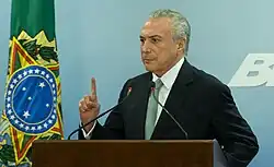 Temer himself was mentioned in the plea bargains, where he allegedly attended two meetings with the Odebrecht informants to arrange bribes.[10] In addition to the Odebrecht plea bargains, Temer also appears in the plea bargains of lobbyists Júlio Camargo and Fernando Baiano, Sérgio Machado, and the expelled senator Delcídio do Amaral. However, none of these plea bargains could be investigated as Temer enjoys "temporary immunity": the President of the Republic cannot be the target of investigations for events that occurred outside his term of office.[10]