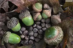 Acorns play an important role in forest ecology when oaks are plentiful or dominant in the landscape.[6] The volume of the acorn crop may vary widely, creating great abundance or great stress on the many animals dependent on acorns and the predators of those animals.[7] Acorns, along with other nuts, are termed mast.