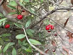 Acrotriche aggregata, commonly known as red cluster heath, tall acrotriche or tall groundberry[2] is a species of flowering plant in the family Ericaceae and is endemic to eastern Australia. It is an erect, spreading shrub, with elliptic to egg-shaped leaves, and spikes of tube-shaped, pale green, cream-coloured or white flowers, and succulent red drupes.