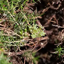 Acrotriche serrulata, commonly known as honey pots,[2] is a species of flowering plant in the family Ericaceae, and is endemic to south-eastern Australia. It is a low-lying, mat-forming shrub with lance-shaped to linear leaves, pale green to whitish, cylindrical flowers and greyish-green fruit.
