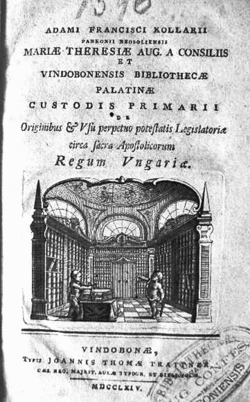 Adam F. Kollár was closely associated with the centralist policies of Empress Maria Theresa. Some of his publications were commissioned by her Court, although not marked as such, many others espoused its policies.[17] As a native of the Kingdom of Hungary, the Habsburg province that resisted centralization the most, he knew its situation. He devoted his 1764 work De Originibus et Usu perpetuo... (On the Origins and Perpetual Use of the Legislative Powers of the Apostolic Kings of Hungary in Matters Ecclesiastical) to argue for the supremacy of the Habsburgs' rule over the Roman Catholic hierarchy, over the traditional legislative powers of the Kingdom's Diet and, indirectly, over the privileges of its nobility. Kollár supported his and the Habsburgs' position with a copious body of references to the Kingdom's history,[18] his Historiae diplomaticae... from 1762 already contained a large part of the documentation. Among other things, Kollár proposed that the tax-free status of the Kingdom's nobility be abolished. De Originibus et Usu perpetuo... brought about the most explosive event in Kollár's political life. The book caused outrage during the 1764–1765 Diet attended by Maria Theresa and did nothing to reinforce her position. She launched damage control with a ban on further distribution of Kollár's book in the Kingdom of Hungary that included a recall of the sold copies, he was given a hint by the Habsburgs to write an apology, which he did half-heartedly in the form of a defense, and the Vatican put the book on its index librorum prohibitorum where it stayed for the next two centuries.[8]