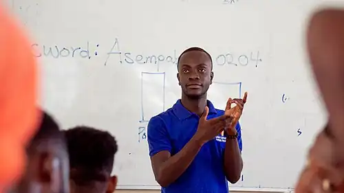 Today, Adamorobe Sign Language faces significant challenges. The number of deaf individuals in the village has declined due to the marriage policy that discouraged unions between deaf people.[3] Additionally, the younger generation of deaf children is increasingly adopting Ghanaian Sign Language through formal education, which reduces the intergenerational transmission of AdaSL.[4]